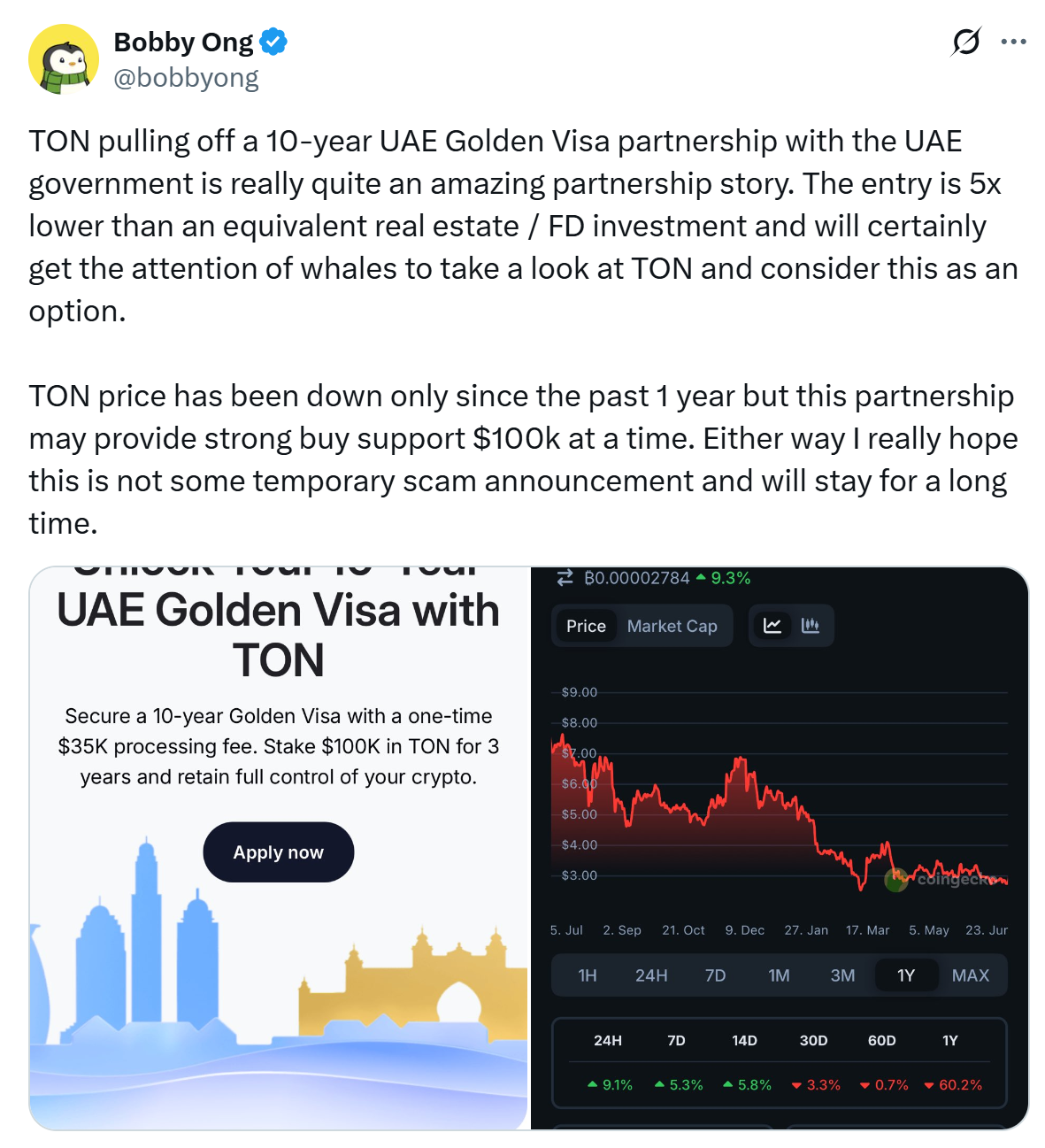 Відкрита мережа (тонна), платформа blockchain, що виходила з Telegram, оприлюднила новий шлях до резиденції ОАЕ, пропонуючи 10-річні золоті візи заявникам, які ставлять на три роки, що коштує 100 000 доларів США (тонни) і сплачують одноразову плату за обробку в розмірі 35 000 доларів.