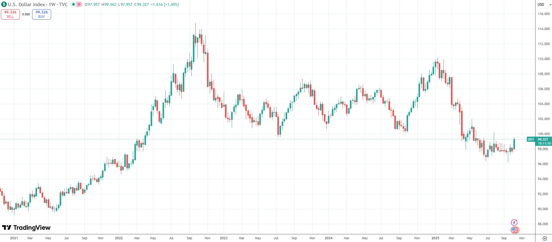 Цього року він впав приблизно на 12%, з максимуму 110 у січні до трирічного мінімуму 96,3 в середині вересня, перш ніж відновитись у жовтні, повідомляє TradingView.