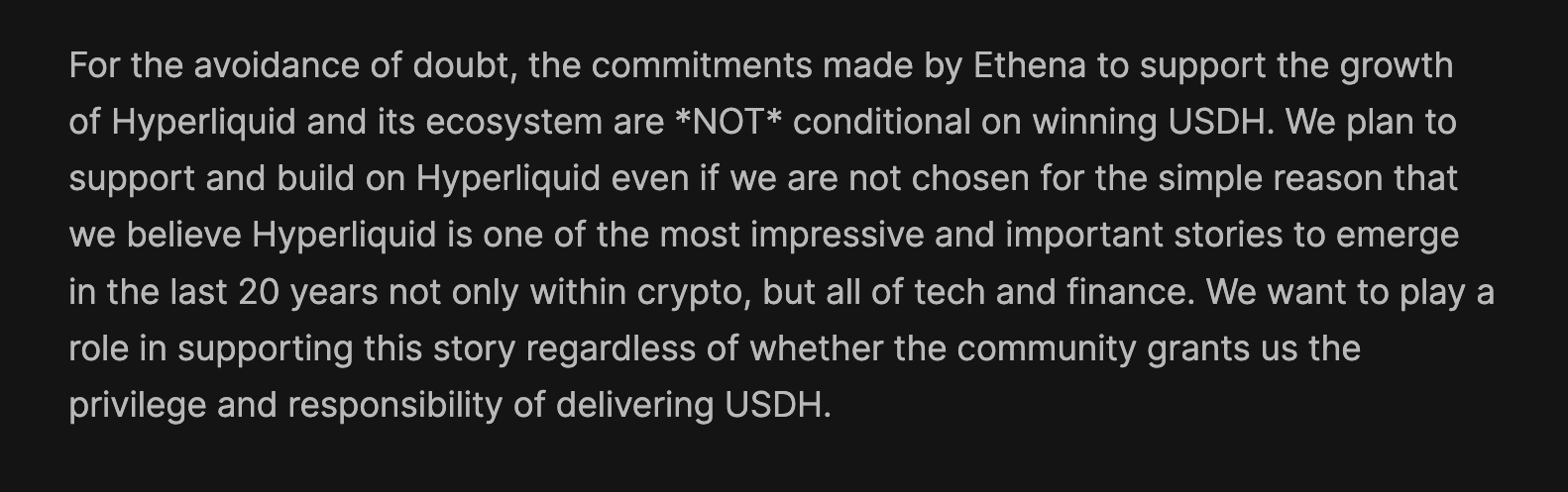 Команда, що стоїть за USDE та USDTB, пропонує версію USDH, повністю підкріпленої USDTB, StableCoin, прив’язаної до фонду Buidl BlackRock і незабаром буде виданий через Digital Bank Anchorage. Якщо обраний, Етена пообіцяла повернути 95% резервного доходу громаді Hyperliquid та впровадити гарантії за допомогою обраного валідатора “мережа опікунів”.