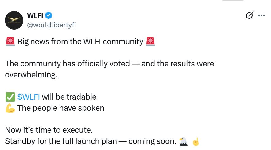 Не всі токени управління будуть розблоковані одразу, повідомляє команда WLFI, і незабаром з’явиться повний план запуску, згідно з повідомленням WLFI на X у середу.