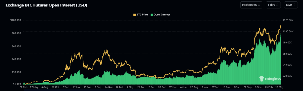 За даними Coinglass, понад 80 мільярдів доларів ф’ючерсних контрактів Bitcoin залишаються відкритими. Це найбільша загальна кількість рекордів. Торговці збільшили позиції приблизно на 30% з 1 травня. Багато хто використовує позикові кошти, щоб зробити ставку на більш високі ціни. Великі кроки в будь -якому напрямку можуть викликати примусові продажі, якщо ринок перевернеться.
