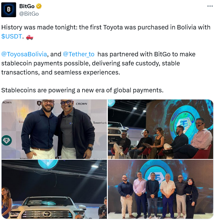 Bitgo заявив, що він співпрацював з Tether та Bolivia Toyota, щоб допомогти їй у самоконстатурі, забезпечуючи безперебійне проведення транзакцій