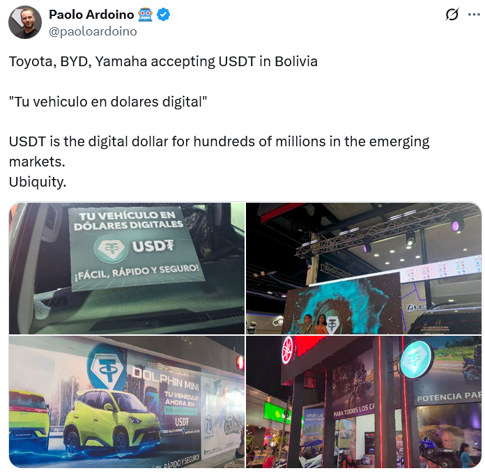 Генеральний директор Tether Paolo Ardoino поділився, що Toyota, Yamaha та Byd беруть Tether (USDT) для оплати в неділю, а фірма з питань криптовалюти Bitgo підтвердила, що перша Toyota була придбана в Болівії з USDT у суботу.