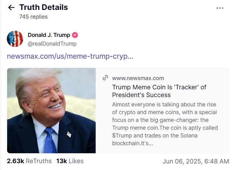 У публікації про свою платформу соціальних медіа Truth Social, Трамп поділився статтю Newsmax, в якій обговорюється, як його офіційний токен криптовалюта служить показником політичного імпульсу, що повторює погляди, якими поділяються деякі фігури криптовалют.