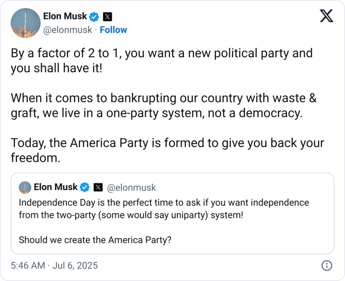 У неділю Муск розмістив свою платформу X, що він формував “Партію Америки”. Він пообіцяв створити його, якщо Конгрес прийняв масовий податок та витрати Трампа, який він зробив у четвер.