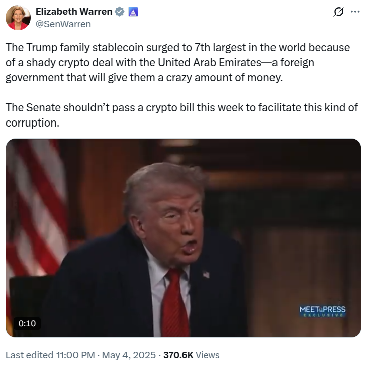 У пості 4 травня на X Уоррен заявив, що стаблекуїн сім’ї Трампа зросла на ринковій вартості через “тінисту угоду про криптовалюту з Об’єднаними Арабськими Еміратами”, яка передбачала врегулювання інвестицій за допомогою долара США. Вона стверджувала, що це викликало серйозні проблеми національної безпеки і застеріг від Сенату, що прийняв криптовалютне законодавство.