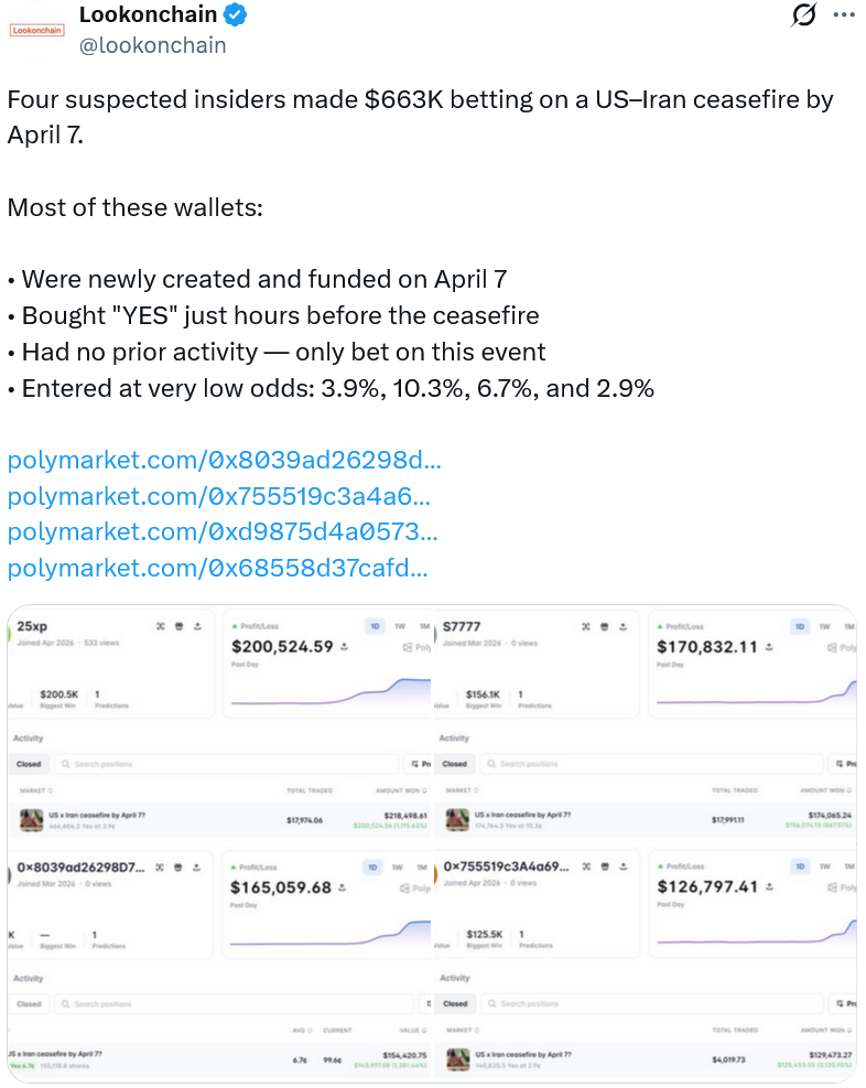 Гаманці були створені та профінансовані у вівторок і не мали попередньої активності до того, як зробили ставку на ринку «США та Іран припинення вогню до 7 квітня» Polymarket, дані блокчейну, опубліковані Lookonchain у середу.