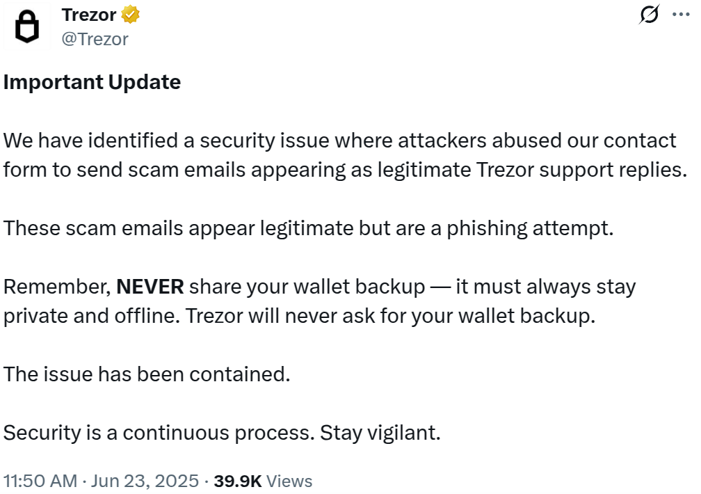 У понеділок X, Трезор попередив, що фірма знає, що “зловмисники зловживають нашою контактною формою, щоб надіслати аферичні електронні листи, що відображаються як законні відповіді на підтримку” Тезор “. Компанія нагадала своїм клієнтам не ділитися резервними копіями гаманця, зазначивши, що їх завжди слід зберігати “приватні та офлайн”.