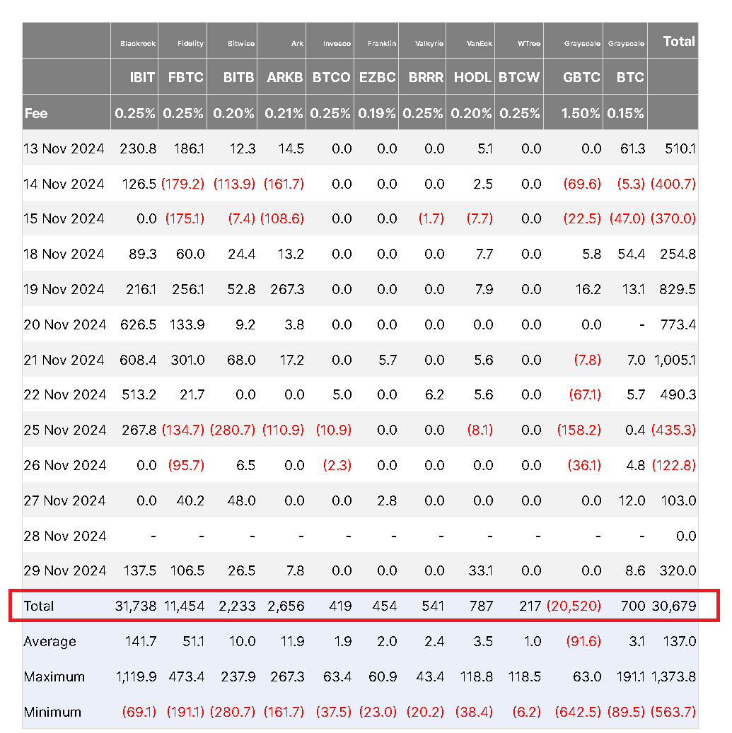 Місячне зростання цін у листопаді призвело до зростання цін на біткойни (BTC) приблизно з 68 000 доларів США до 99 000 доларів США. На тлі позитивних настроїв спотові BTC ETF разом заробили 6,87 мільярда доларів із відтоком 411 мільйонів доларів протягом місяця.