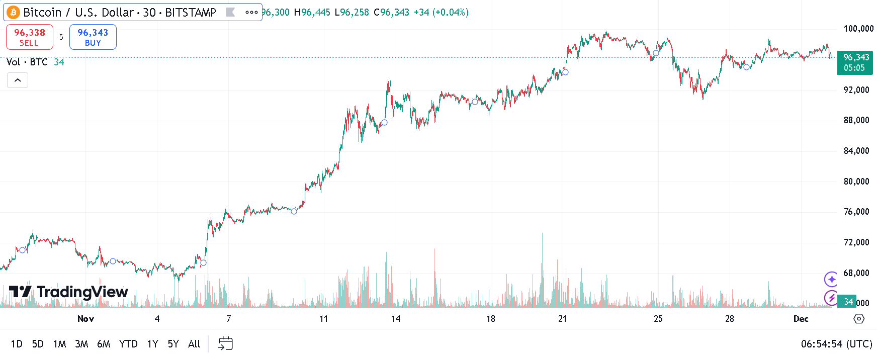 На початку грудня показник індексу знизився, але продовжує відображати надзвичайно позитивні настрої. Дані Cointelegraph Markets Pro і TradingView показують, що BTC у грудні знизився до 96 000 доларів США.