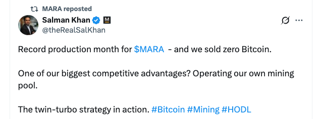 “Один з наших найбільших конкурентних переваг? Керування власним майнінг -пулом”, – написав Хан у публікації X у вівторок, 3 червня.