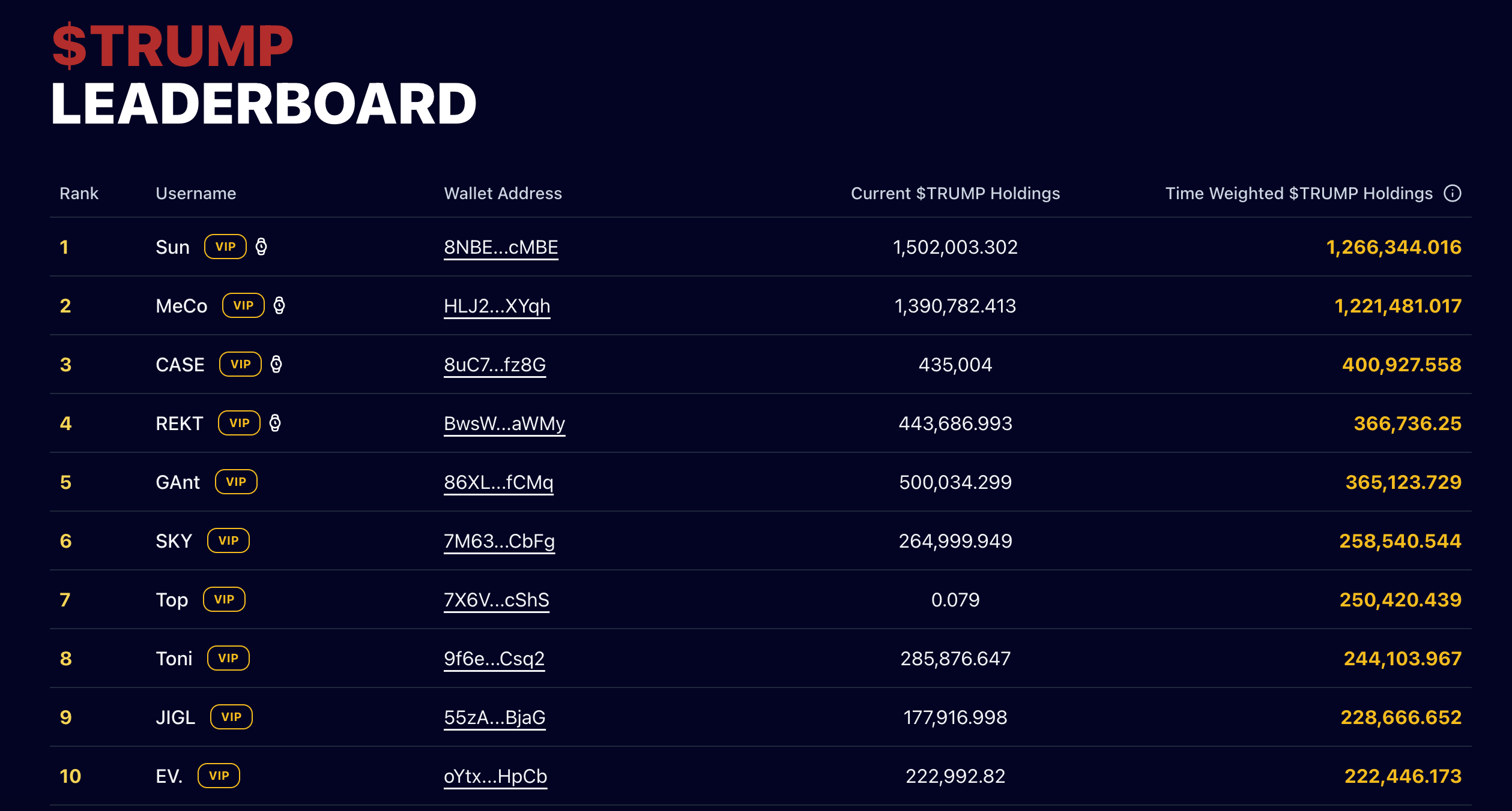 Станом на 7 травня особистість топ -токенерів та тих, хто може вирішити подати заявку на вечерю Трампа 22 травня та “Спеціальний VIP Tour”, були невідомі. Однак проект заявив, що кожен, хто подав заявку, не може принести гостям, повинен пройти попередню перевірку, і “не може бути з країни -списку годинників”.