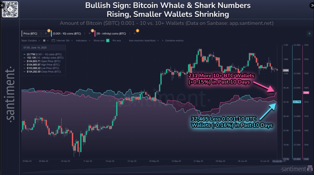 На основі звітів постачальника даних про надання даних Santiment, великі власники забирають монети, навіть коли менші інвестори відступають. Протягом останніх 10 днів гаманці з щонайменше 10 BTC піднялися на 231 адреси.