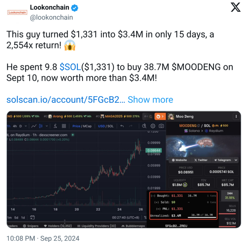 Кмітливий інвестор перетворив 1300 доларів США на 3,4 мільйона доларів після досягнення вражаючої 2554-кратної прибутковості інвестицій у токен Moo Deng (MOODENG), повідомив Cointelegraph 26 вересня.