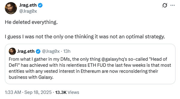 Колишній менеджер продукту Consensys Джиммі Рагоса закликав Маркантоніо та Galaxy Digital, заявивши, що з того, що він може зібрати з прямих повідомлень, єдине, чого досягнув “невблаганний ETH FUD”, – це те, що “більшість суб’єктів, які мають будь -який інтерес до Ethereum, зараз переглядають свій бізнес галактикою”.