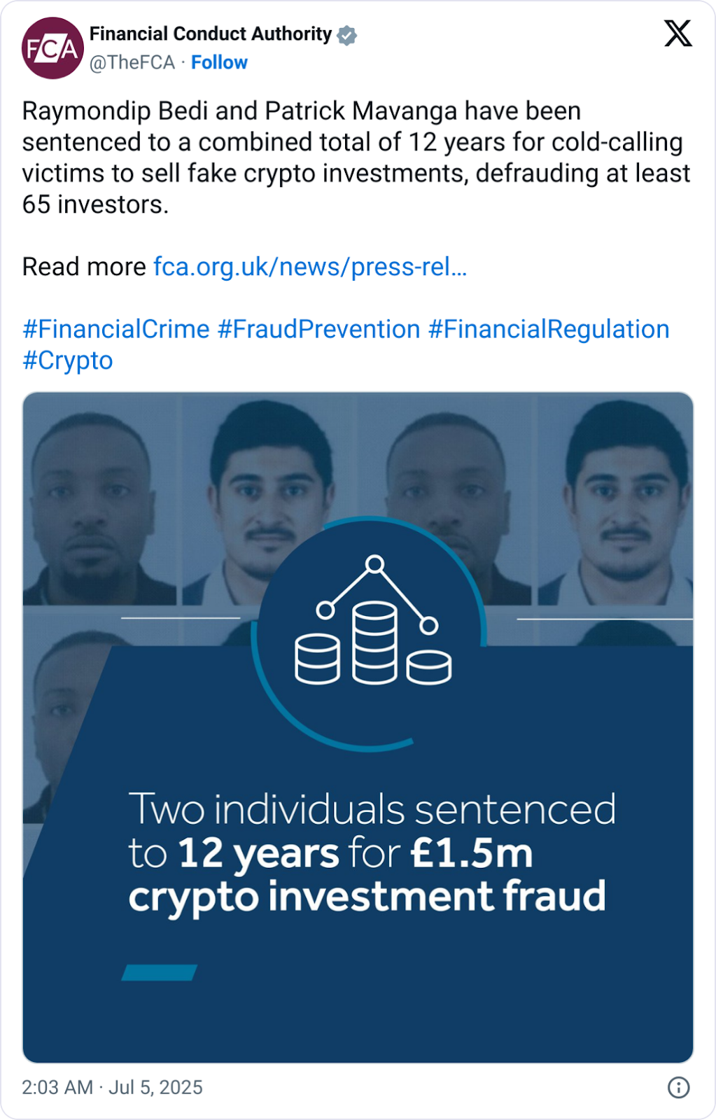 Вирок у п’ятницю, FCA заявив, що суддя суду коронного суду Саутварка Гріффітс зауважив, що Беді та Маванга “обидва були провідними гравцями в змові, згідно з якими жертв шахрайства переконували інвестувати в консультацію з криптовалют”