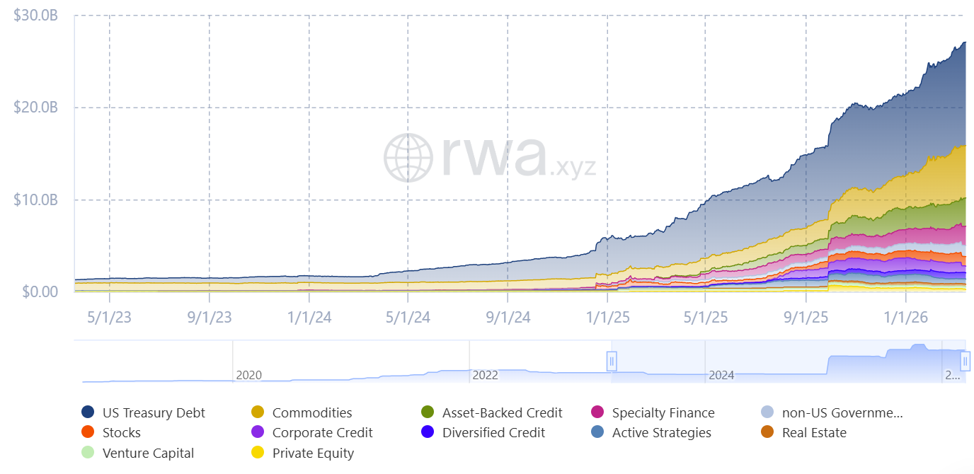 Цей поштовх стався, коли токенізація стала одним із випадків використання блокчейну, який найшвидше розвивається. Галузеві дані свідчать про токенізовані активи на суму понад 27 мільярдів доларів у різних продуктах, починаючи від приватних кредитів і закінчуючи казначейськими облігаціями та акціями США.