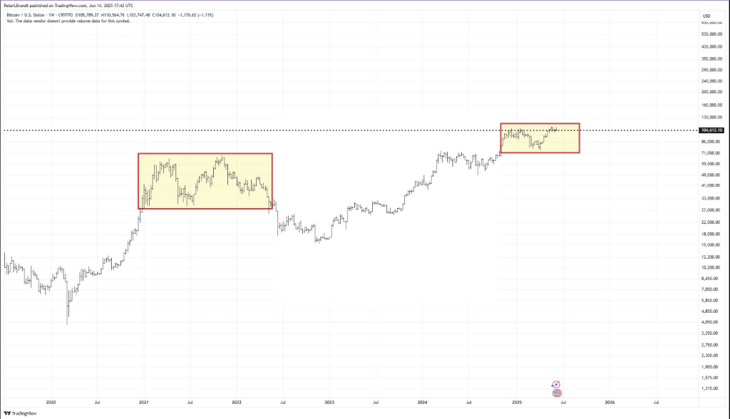 Біткойн знову перебуває на перехресті. Ціни підбираються від 61 000 до 104 000 доларів протягом приблизно семи місяців. Цей діапазон дуже схожий на 31 000 – 64 000 доларів на бік, перш ніж різке падіння на початку 2022 року. Торговці та аналітики розбиті над тим, чи збирається повторити себе історію, чи свіжий попит буде тримати біткойн вгору.