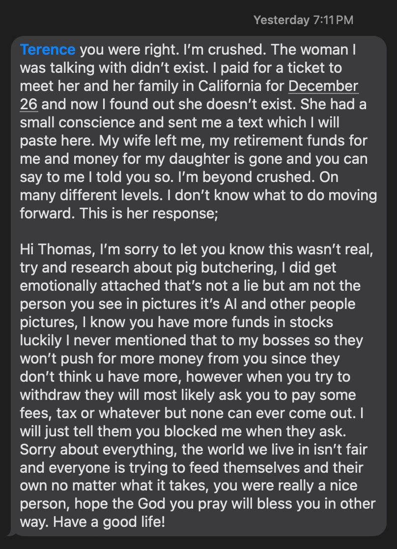 «Мій клієнт попався на шахрайство з розрізанням свиней», — сказав Майкл у неділю. «І вчора ввечері під час обіду я отримав від нього жахливе текстове повідомлення, в якому говорилося, що він усе втратив».