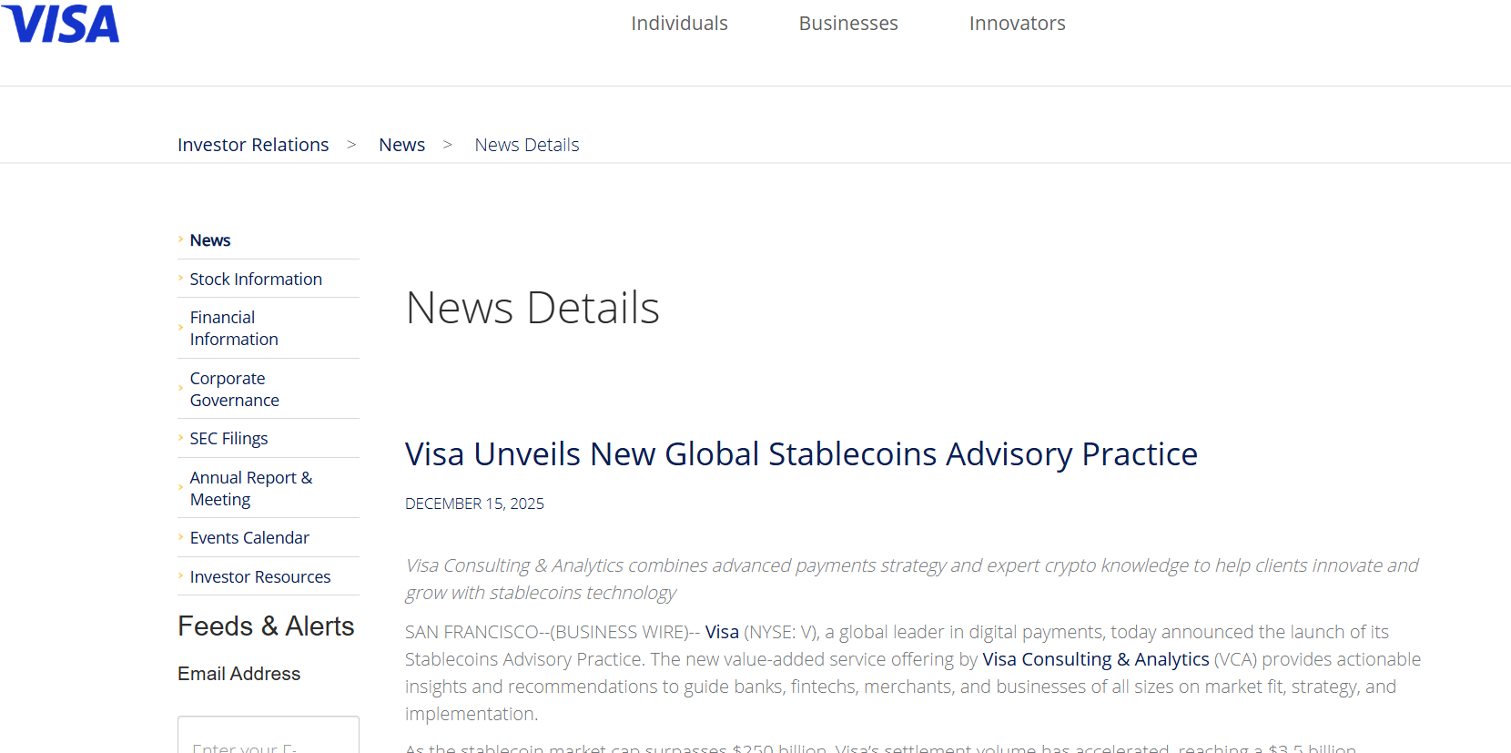 Платіжний гігант заявив у понеділок, що нова консультативна група зосереджуватиметься на практичних питаннях, з якими стикаються традиційні гравці, і пропонуватиме навчання стейблкоїнам і програми ринкових тенденцій, планування виходу на ринок і технологічні можливості для інтеграції стейблкоїнів.