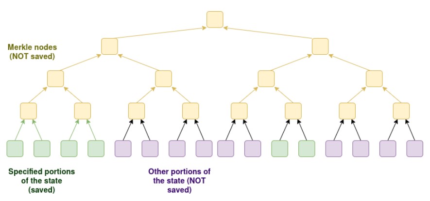 Вузли працювали б шляхом перевірки блоків безглуздо. Це означає, що вони не потребують зберігання повних доказів Merkle або всієї історії блокчейна. Вони можуть селективно підтримувати певні частини держави на сьогоднішній день.