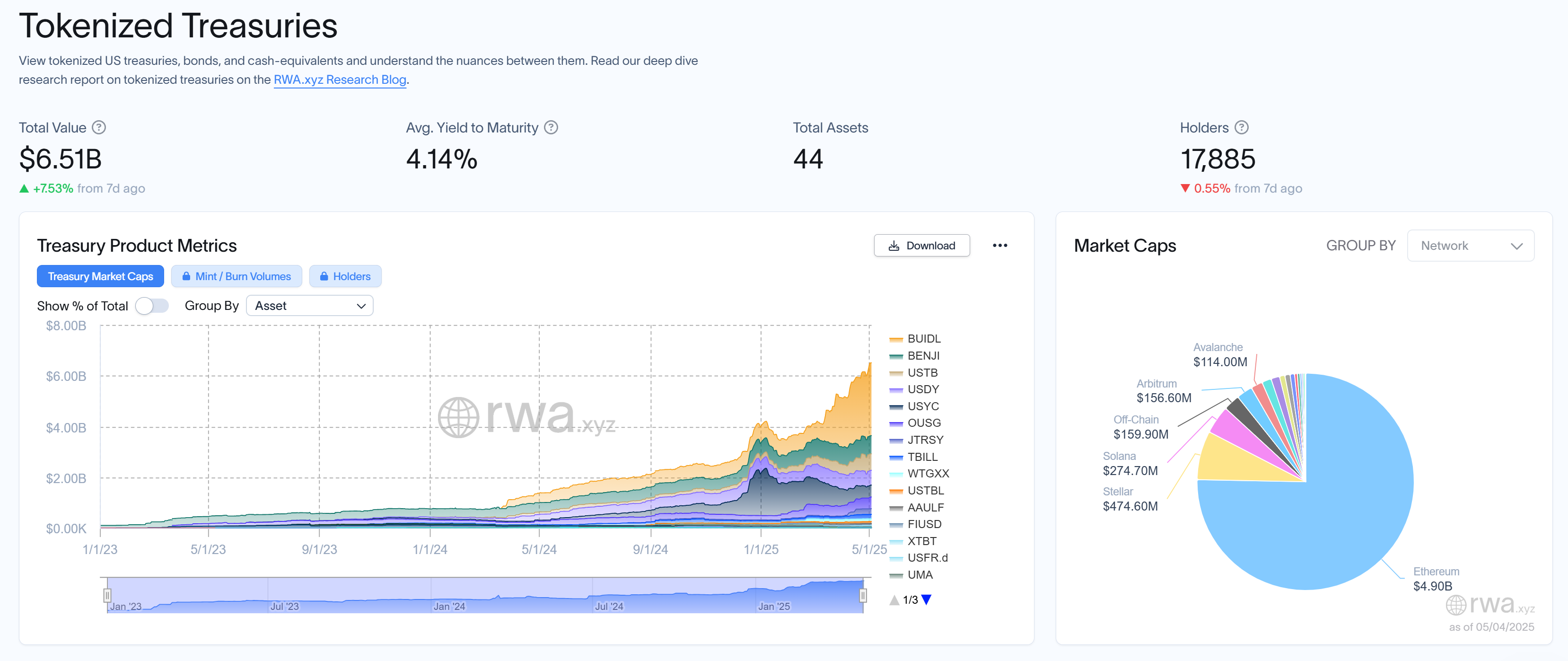 Згідно з даними RWA. XYZ, ринкова вартість токенізованих казначейських казначей в даний час становить 6,5 мільярда доларів. Ethereum припадає на левову частку ринку, розміщуючи понад 4,9 мільярда доларів у токенізованих скарбницях.