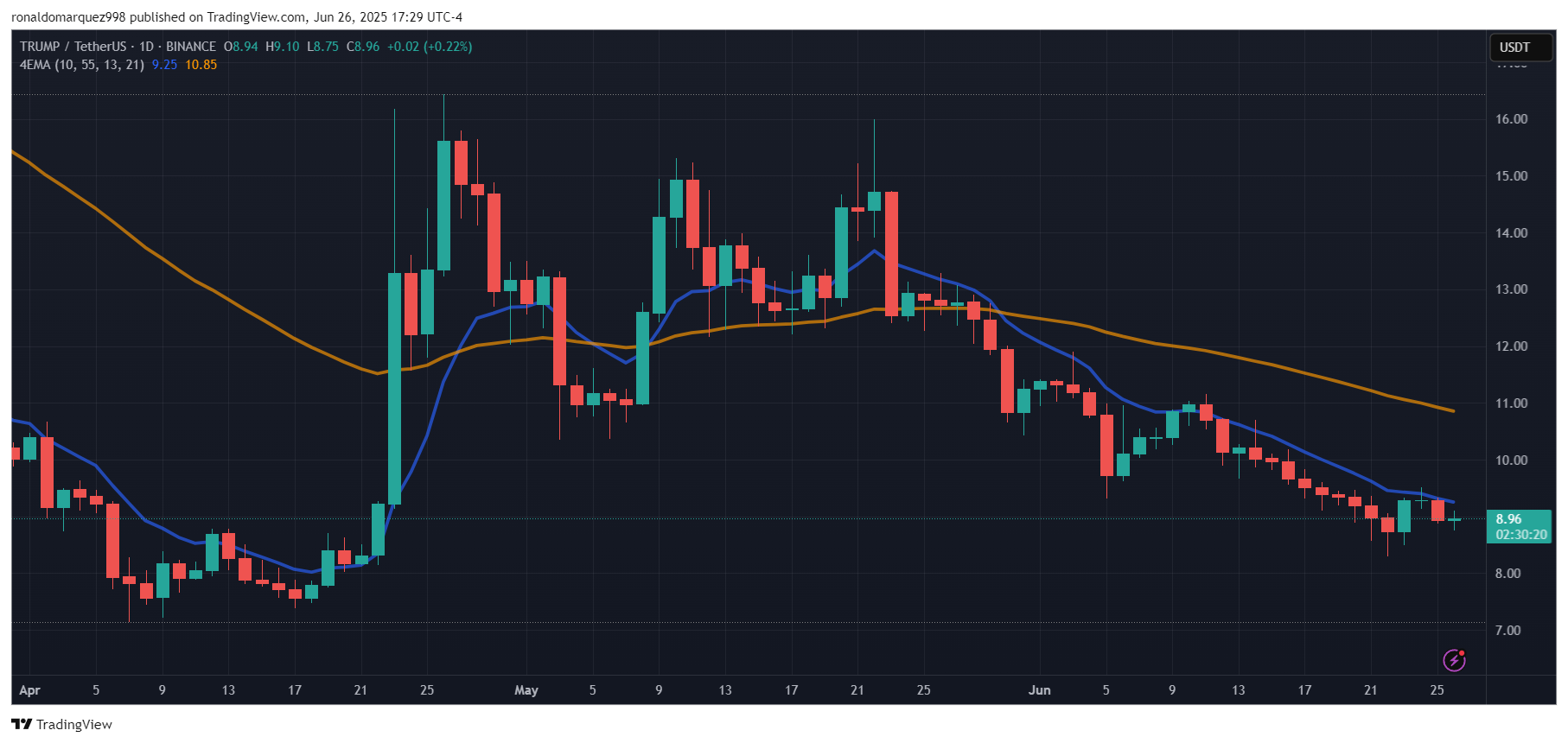 Станом на час преси, офіційний Трамп Мемекайн торгує на рівні 8,96 долара, зафіксувавши значне падіння на 30% у щомісячні часові рамки.