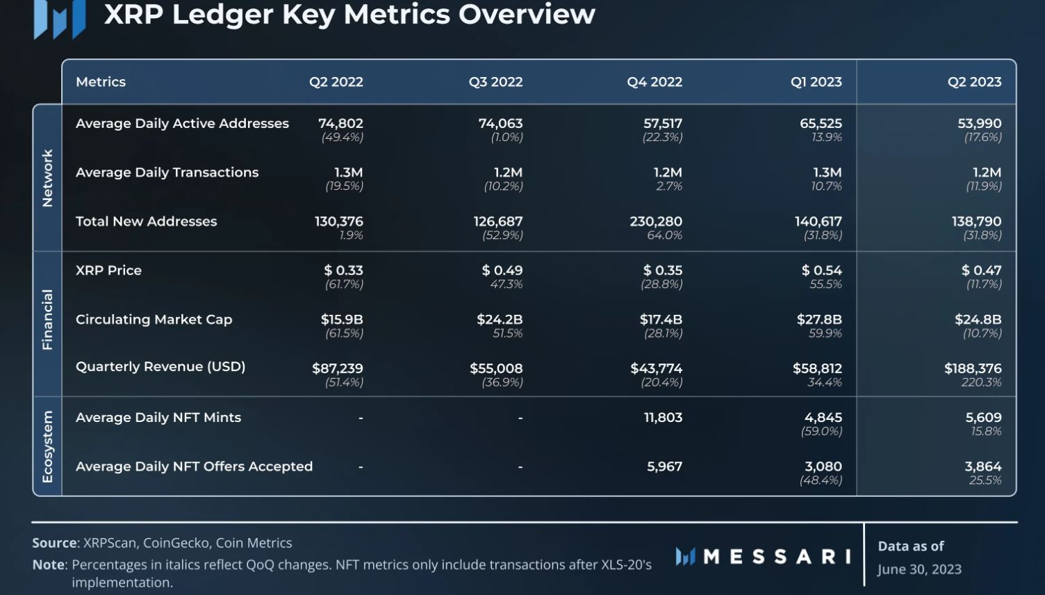 Незважаючи на триваючі занепокоєння щодо позову Ripple проти SEC, XRP продемонстрував значне зростання в багатьох сферах свого протоколу протягом другого кварталу (2 квартал) цього року, як виявилося в нещодавньому звіті платформи аналітики криптовалют Messari.
