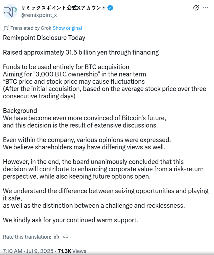 Компанія Remixpoint, що базується в Токіо, зібрала 31,5 мільярда ієн (близько 215 мільйонів доларів), щоб розширити свою скарбницю Bitcoin, згідно з повідомленням у середу.