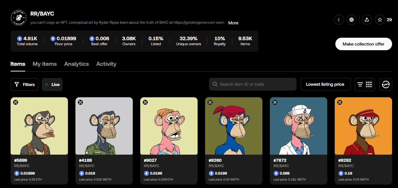 Юристи Ріппса та Каена стверджували, що NFT RR/BAYC, вперше випущені в травні 2022 року, були сатирою та пародією на справжню колекцію яхт-клубу Bored Ape Yacht Club і були захищені законами про свободу слова.