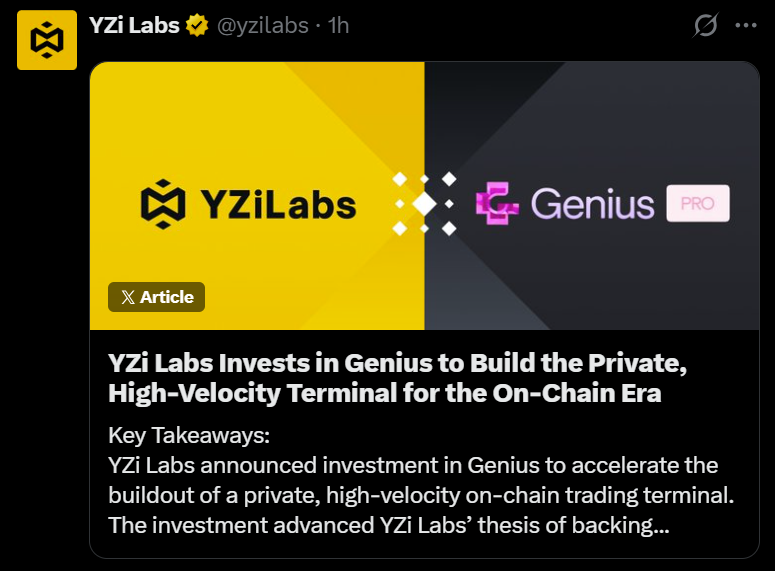 YZi Labs назвала цю динаміку однією з причин підтримки Genius Trading, метою якої є консолідація торгівлі в основних блокчейн-мережах, надаючи пріоритет якості виконання та конфіденційності для професійних трейдерів.