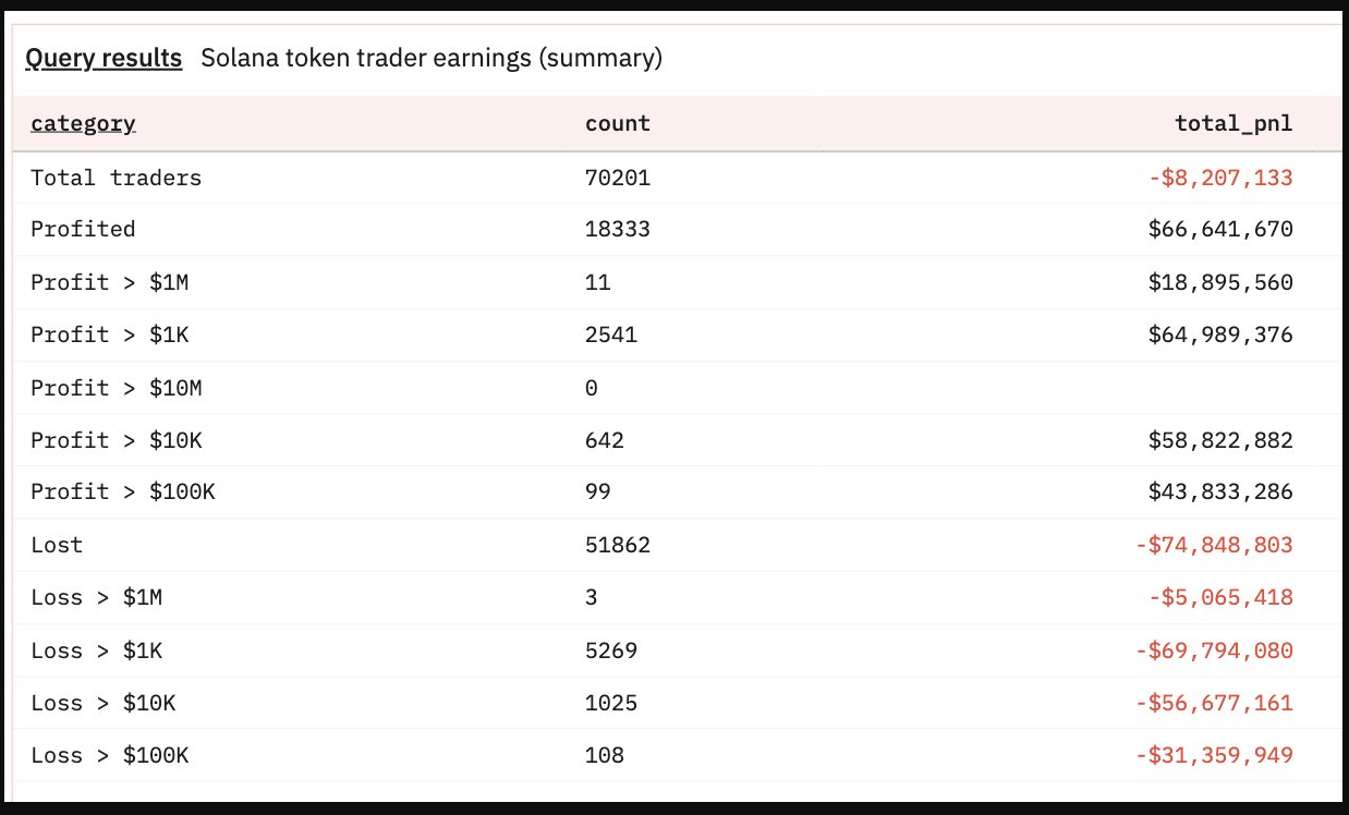 На тлі масштабних збитків від більшості торговців токенів лише 11 із 70 000 гаманців отримали понад 1 мільйон доларів прибутку, тоді як 99 отримали понад 100 000 доларів, підкреслюючи фінансові ризики марки, залежних від знаменитостей, з відсутністю корисності блокчейна.
