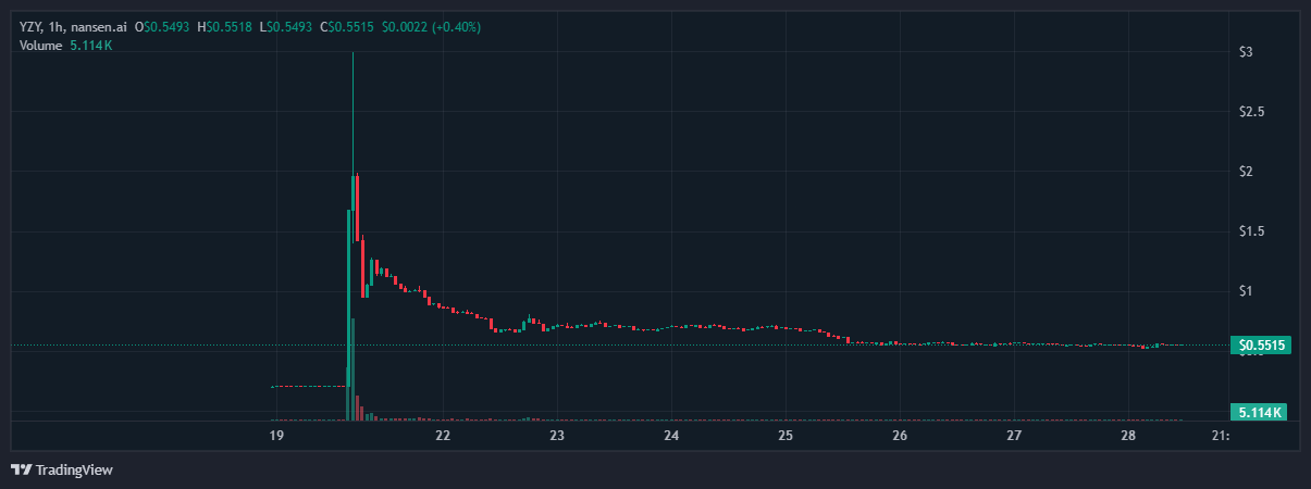 Тим часом ціна Yzy Token знизилася на 80% від його найвищого часу, торгуючи на рівні 0,5515 доларів, лише 19 531 торговці, що тримають маркер, дані Blockchain Intelligence Platform Nansen показує.