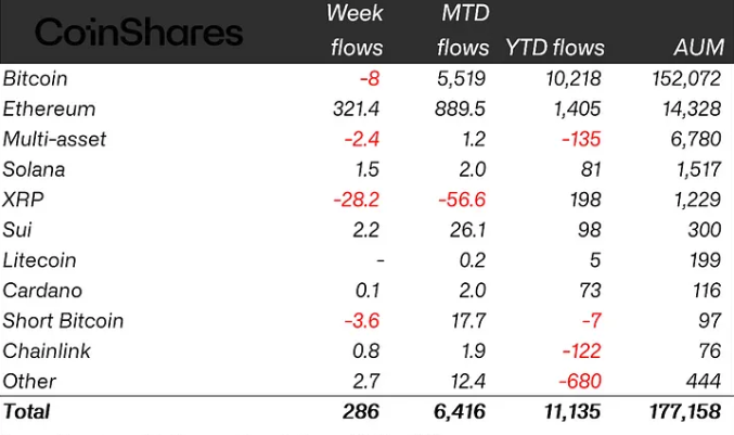 Ефір (ETH) ETP очолила купівлю криптовалюти минулого тижня ETP з припликами на загальну суму 321 мільйон доларів, відзначаючи найсильніший пробіг з кінця грудня 2024 року та відображаючи значне поліпшення настроїв.