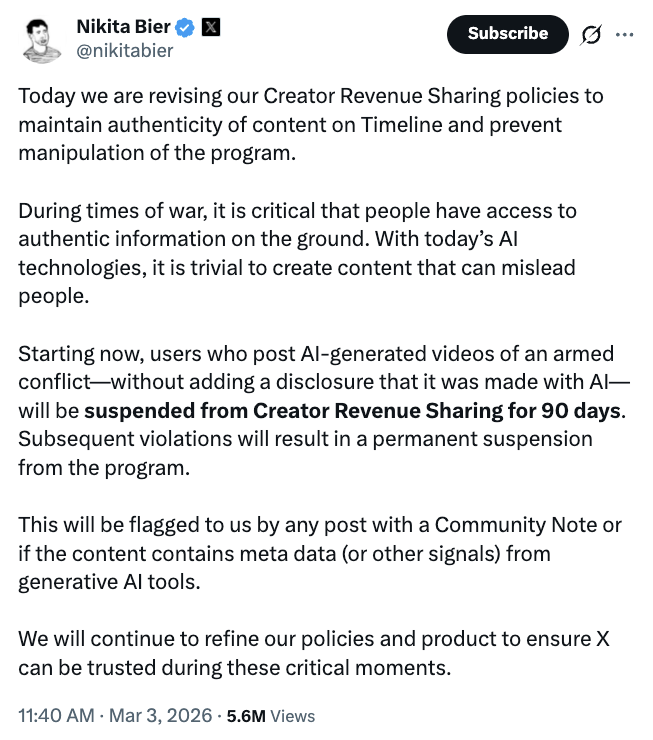 Минулого місяця керівник відділу продуктів X Нікіта Бір оголосив про посилені заходи щодо виявлення та видалення антиботів, а також позначки користувачів для вмісту, створеного штучним інтелектом, у рамках ширших зусиль із обмеження автоматизованого спаму та дезінформації.