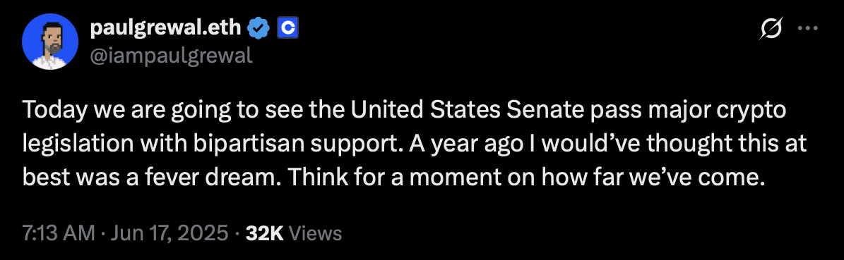 Під час голосування промислові голоси висловили сподівання. Головний юридичний директор Coinbase Пол Греваль прозвучав позитивну ноту на X перед голосуванням, підкреслюючи його потенціал для отримання ясності регуляторів. Однак не всі на борту.