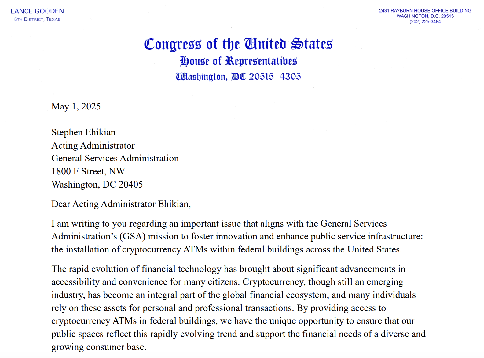 У листі 1 травня до Стівена Ехікіяна, виконуючого обов’язки адміністратора Адміністрації загальних служб (GSA) – суб’єкта, відповідального за управління властивостями уряду США – реп. Ланс Гуден стверджував, що введення банкоматів криптовалют у федеральні будівлі слугуватиме “освітнім ресурсом” та відображає успіх у фінансових технологіях. Він просив, щоб GSA почати вивчати необхідні вказівки та положення, необхідні для встановлення таких банкоматів у підконтрольних урядом нерухомості в США, посилаючись на узгодження з цілями президента Дональда Трампа.
