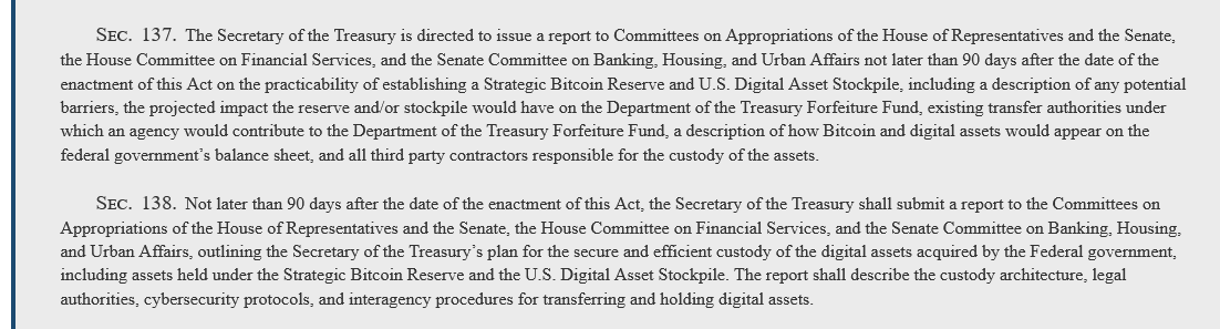 Законопроект про асигнувань Палати, введений у п’ятницю представником Девідом П. Джойсом, містить два розділи, які направляють Міністерство фінансів подати звіт про доцільність, опіку, юридичну владу та заходи кібербезпеки для цифрових активів, що проводяться федеральним урядом протягом 90 днів після прийняття законопроекту.