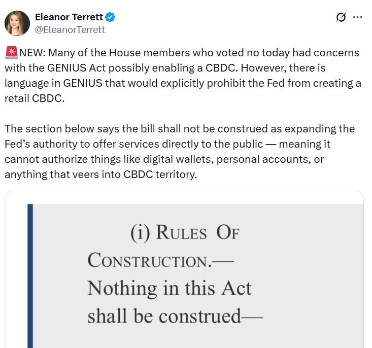 Тим часом Елеонора Терретт, господаря криптовалюти в подкасті Америки, сказала, що геніальний акт вже забороняє ФРС створювати роздрібну торгівлю CBDC.