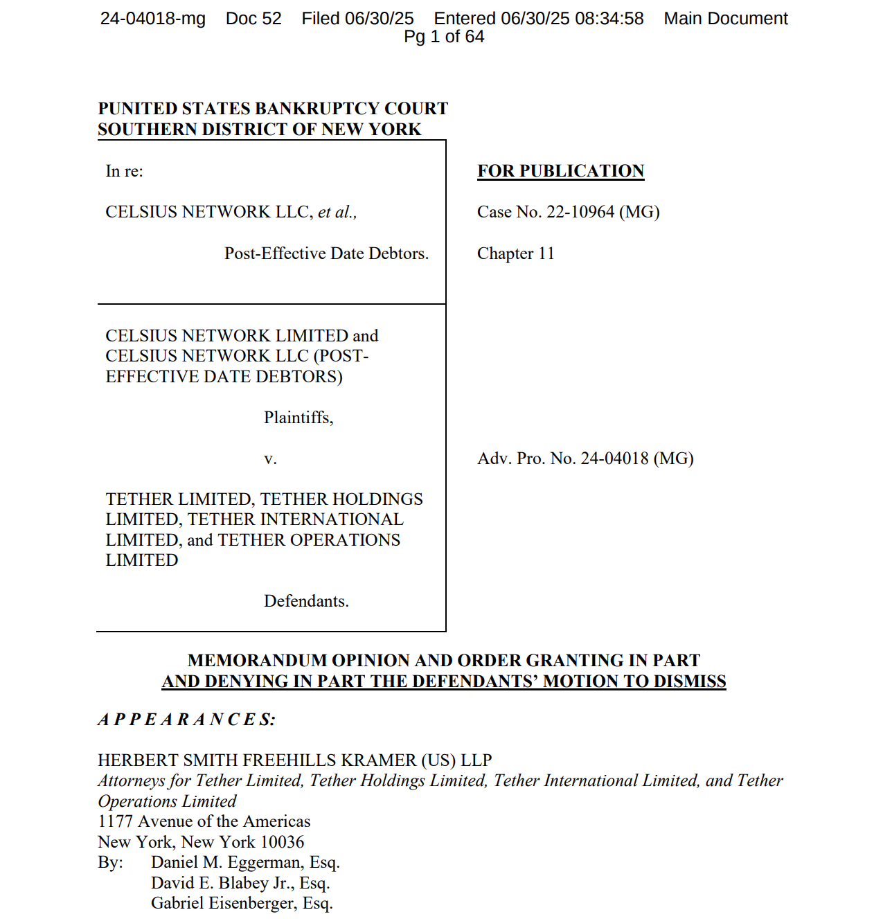 У серпні 2024 року Tether прагнув повністю відхилити позов, стверджуючи, що суду США не вистачає юрисдикції і що твердження Цельсія не в змозі подати дійсні вимоги. Поки Суд відхилив деякі підрахунки, він дозволив ключовим порушенням контракту Цельсія, шахрайським передачею та уподобанням.