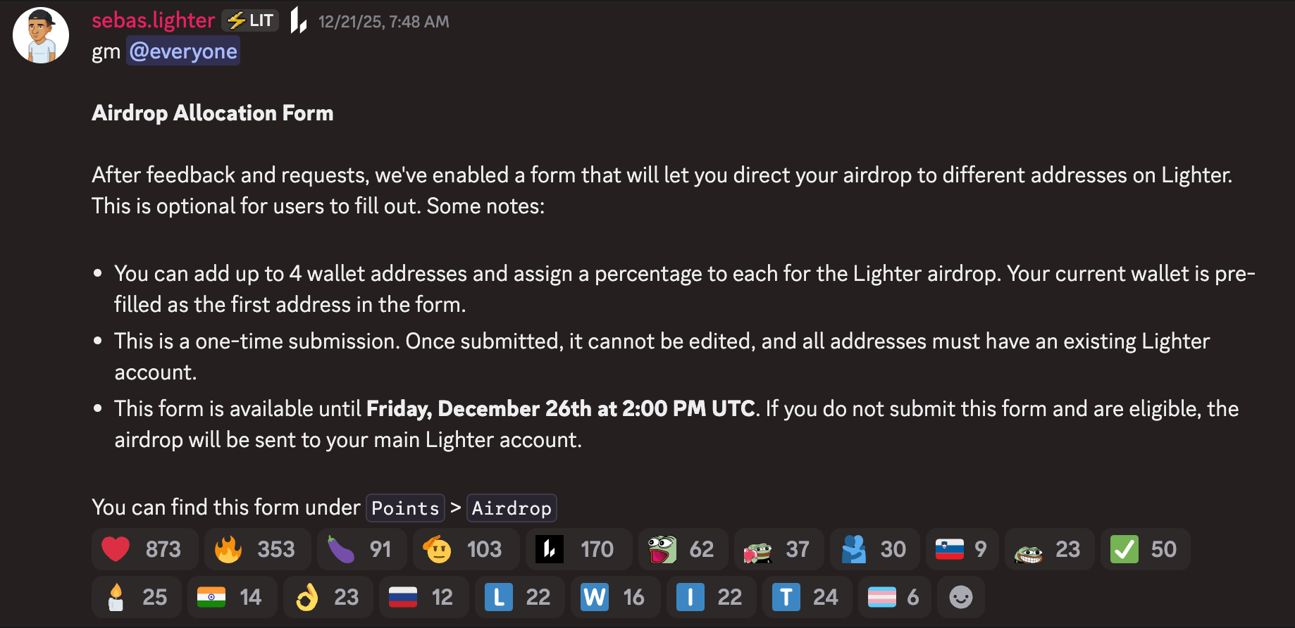 У неділю Lighter запустив форму розподілу за допомогою airdrop, що дозволяє користувачам спрямовувати свої токени до чотирьох додаткових гаманців.