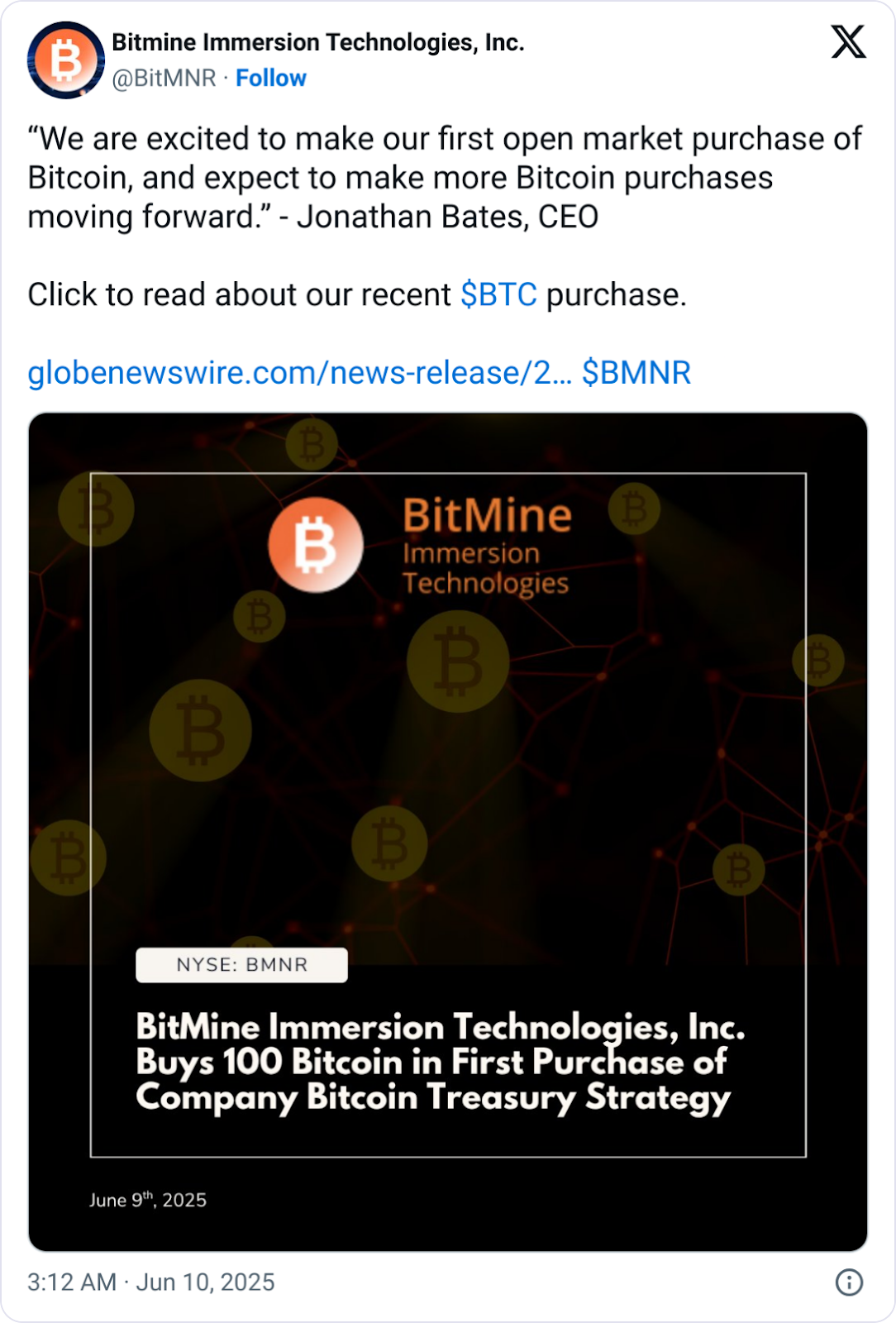 Останньою компанією, яка приєдналася до тенденції, була фірма з прокату видобутку біткойна для видобутку Bitmine Technologies, Inc. (BMNR), яка заявила в понеділок, що вперше придбала 100 BTC, щоб провести резерв після акції в середу, яка спрямована на підвищення на 18 мільйонів доларів.
