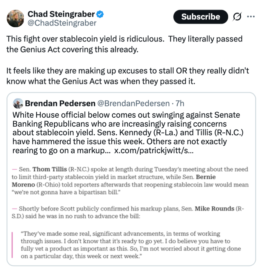 Закон GENIUS забороняє емітентам стейблкойнів пропонувати відсотки або дохідність, але великі криптовалютні біржі все ще винагороджують власників стейблкойнів, і громадські банки стверджують, що усунення заявленої лазівки має вирішальне значення для захисту їхніх кредитних можливостей.