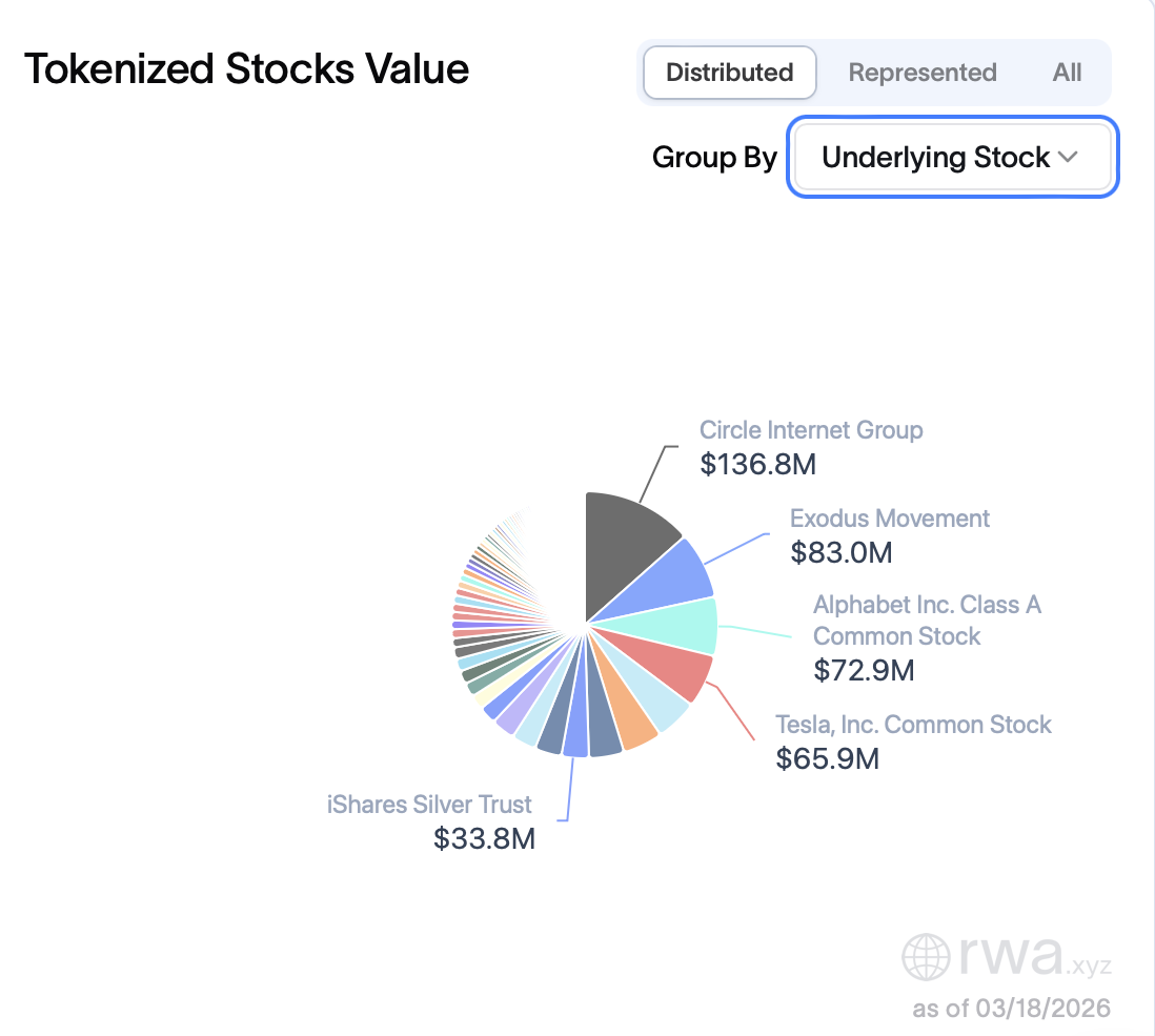 Ринок залишається відносно концентрованим, на чолі з поєднанням токенізованих акцій і біржових продуктів. Circle Internet Group має вартість близько 136,8 млн доларів, за нею йдуть Exodus Movement з 83 мільйонами доларів і Alphabet з 72,9 мільйонами доларів, а Tesla та iShares Silver Trust також є одними з найбільших холдингів.
