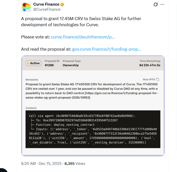 «Ця пропозиція спрямована на продовження фінансування розробки та підтримки екосистеми смарт-контрактів Curve і репозиторіїв програмного забезпечення, підтримку подальшої інтеграції, кросчейн-функцій і вдосконалення інтерфейсу користувача, посилення управління та операційної інфраструктури Curve DAO», — сказав Єгоров.