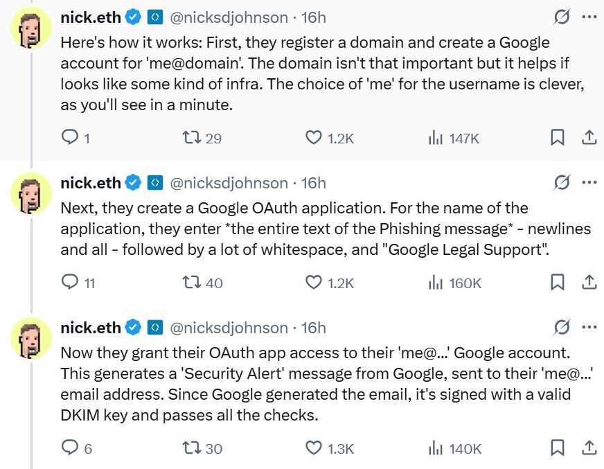“Він проходить перевірку підписів DKIM, і Gmail відображає його без будь -яких попереджень – він навіть ставить його в ту саму розмову, що і інші, законні сповіщення про безпеку”, – сказав він.
