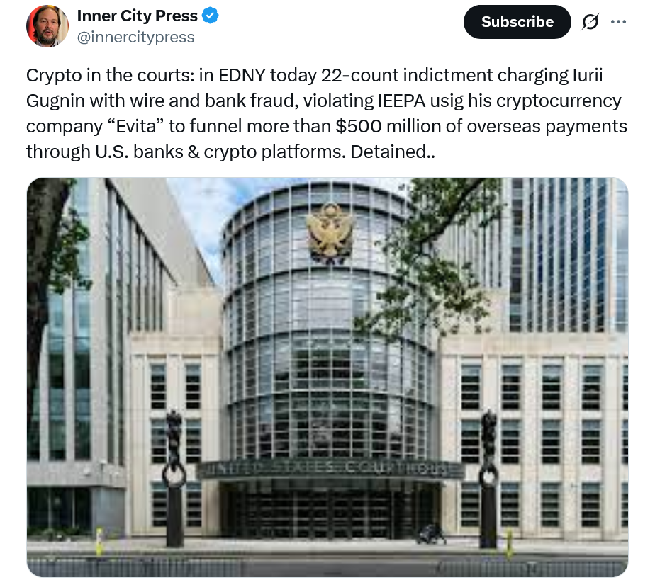 Засновник криптовалюти був заарештований у Нью -Йорку за те, що він нібито використовував свою фірму з криптовалют, Евіта Плат, щоб повернути близько 530 мільйонів доларів США від санкціонованих російських банків, щоб допомогти росіянам отримати доступ до високочутливих американських технологій.
