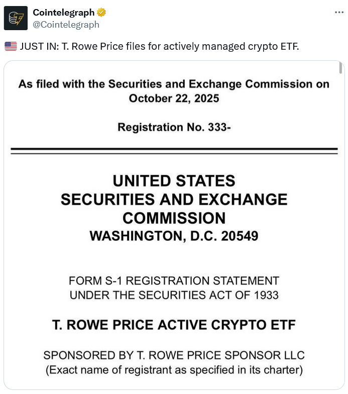 Реєстраційна заява T. Rowe S-1 про запуск активного криптовалютного ETF може похитнути його пропозиції, здебільшого орієнтовані на взаємні фонди — клас активів, який за останній місяць випустив десятки мільярдів доларів.