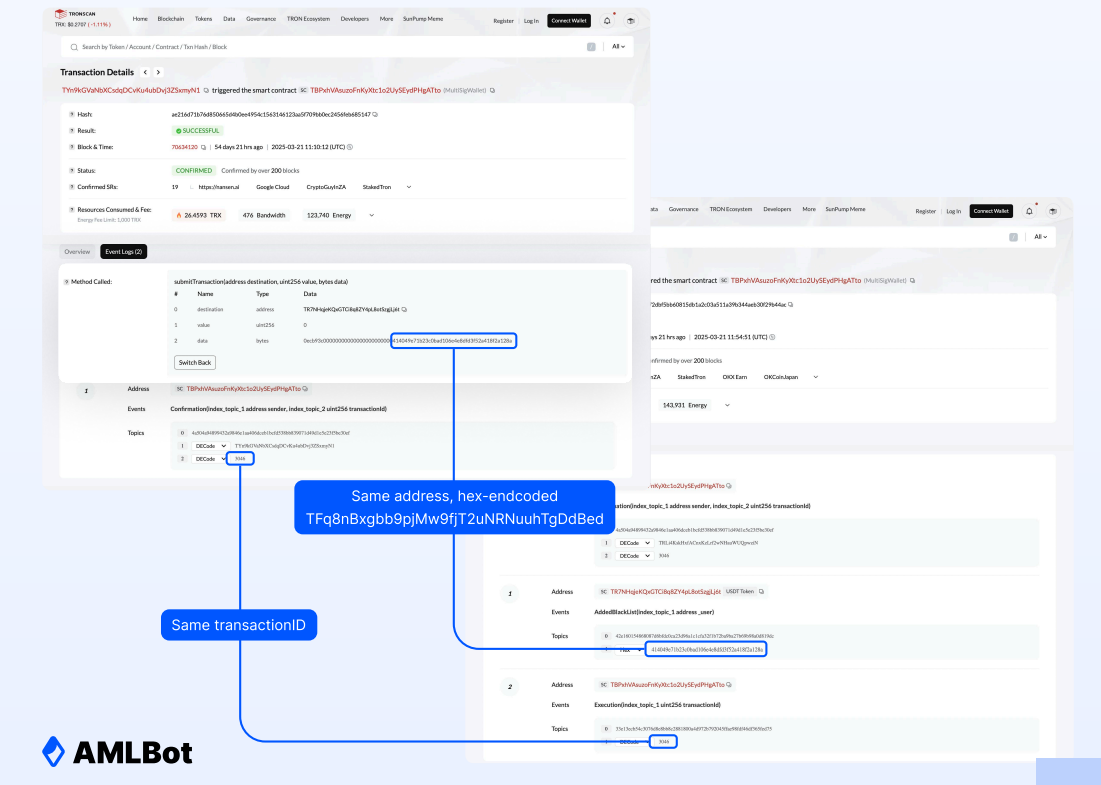 Процедура чорного списку Tether-це багатоетапний процес з першою транзакцією, що ефективно попереджає про майбутній чорний список. По-перше, мультигресивна транзакція адміністратора Tether подає очікуваний дзвінок до “AddblackList” на договорі USDT-TRC20.
