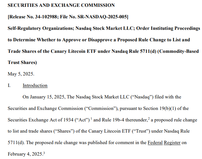 Рішення відбулося через тиждень після того, як SEC затримала свою постанову на ETF Canary Capital’s Litecoin (LTC), аналітик розвідки Bloomberg Джеймс Сейфарт у пості 5 травня.